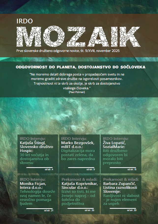 Preberite novembrsko številko revije IRDO Mozaik! Odgovornost do planeta, dostojanstvo do sočloveka. Vabimo vas k branju aktualne številke revije IRDO Mozaik – Prve slovenske družbeno odgovorne novice. “Ne moremo delati dobrega posla v propadajočem svetu in ne moremo graditi zdrave družbe na izgorelosti posameznikov. Trajnostnost ni le skrb za okolje, je skrb za dostojanstvo vsakega človeka.” … Nadaljujte z branjem Odgovornost do planeta, dostojanstvo do sočloveka.