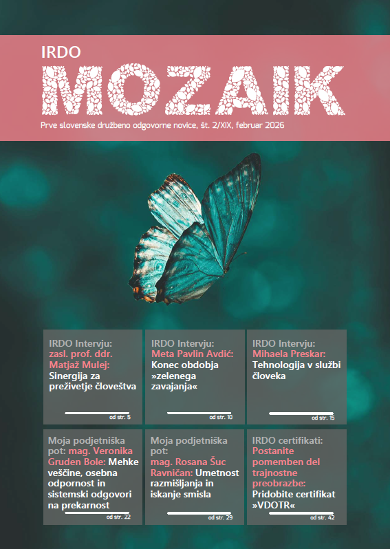 Preberite februarski IRDO MOZAIK: “Gradimo vetrnice, ne zidov!” IRDO Mozaik – Prve slovenske družbeno odgovorne novice, ki izhajajo že 19. leto, čakajo, da jih preberete! “Gradimo vetrnice, ne zidov!” Spoštovani člani in sopotniki na poti trajnostnosti, pred nami je nova (februarska) številka revije IRDO Mozaik, ki jo tokrat preveva misel Konfucija: ‘Ko piha veter sprememb, … Nadaljujte z branjem IRDO MOZAIK, februar 2026: “Gradimo vetrnice, ne zidov!”
